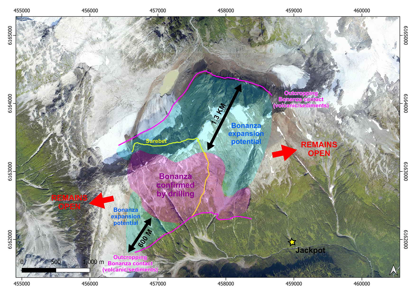 The newly discovered Surebet is a very robust and structurally controlled series of 12 high-grade gold veins/shears with superior continuity and predictability hosted within the Hazelton Sediments and Volcanics over a 1.8 square kilometer area. It has 2.1 kilometers of exposed mineralization at surface (1 kilometer of mineralization along strike and 1.1 kilometer of mineralized downdip extent) with 700 meters of vertical relief.